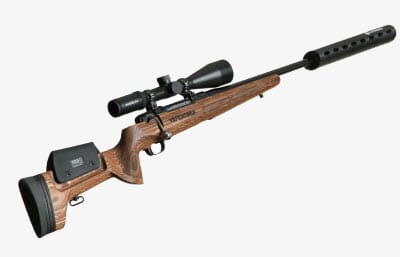 VÅPENSMIA THUNDER by SCHULTZ&LARSEN er en presisjonsrifle av høyeste kvalitet. Den er bygd spesielt for Våpensmia. VS THUNDER er en systemrifle med KKC stokk som enkelt gir deg muligheten til å skifte piper og kaliber. Våpenet veier 3,7 kg. Med påmontert kikkert og lyddemper tilfredsstiller våpenet vekt kravet i jegerklassen.